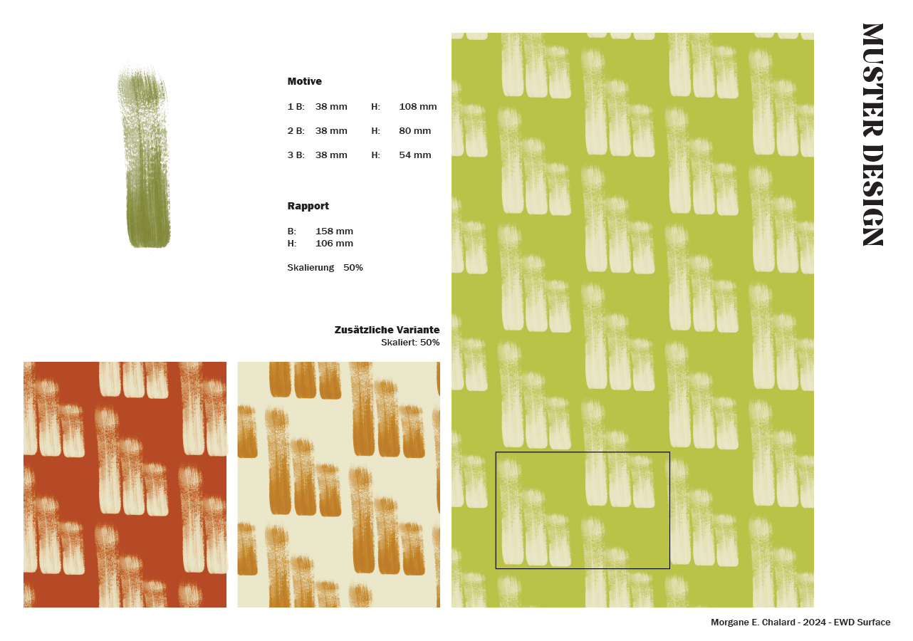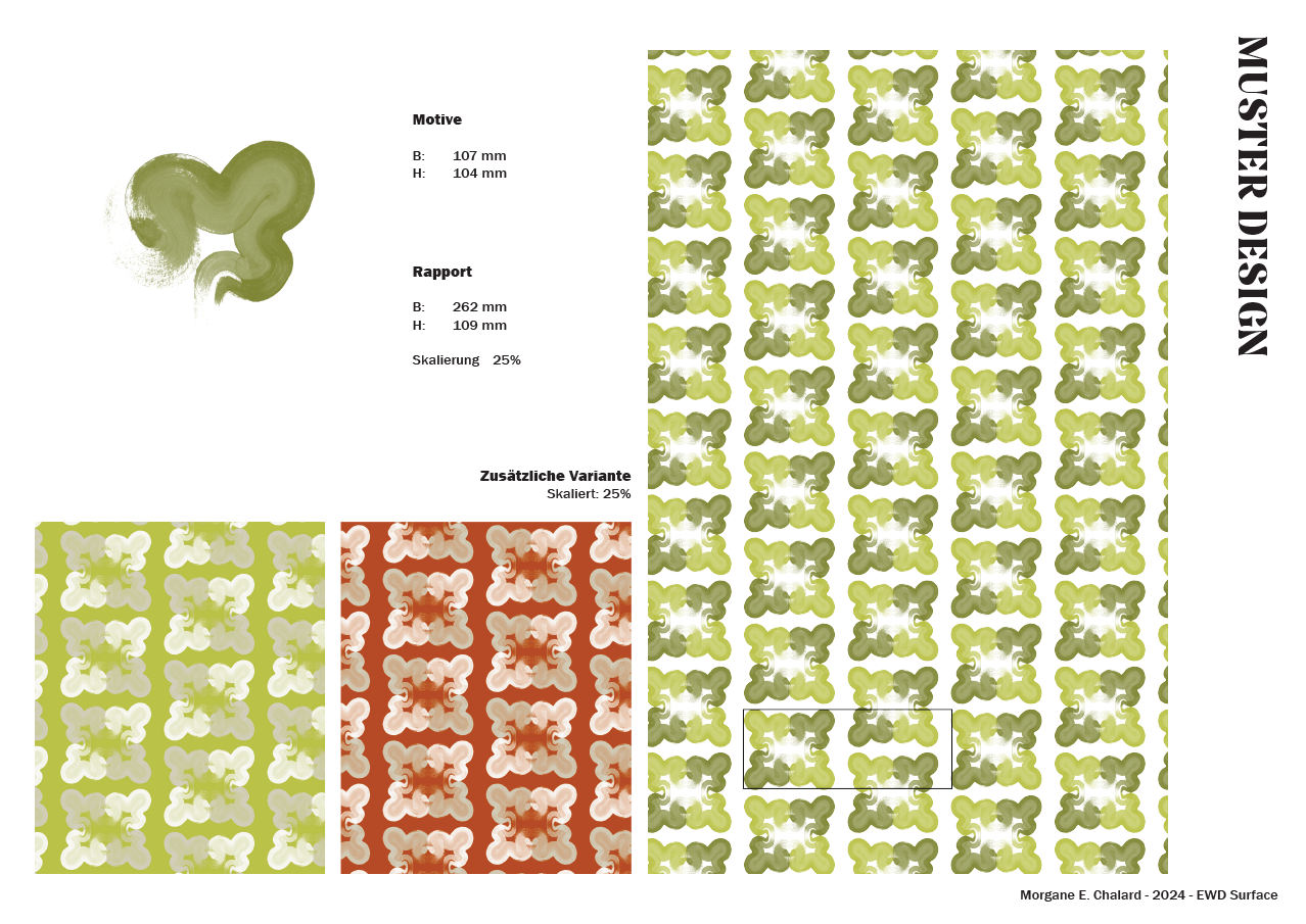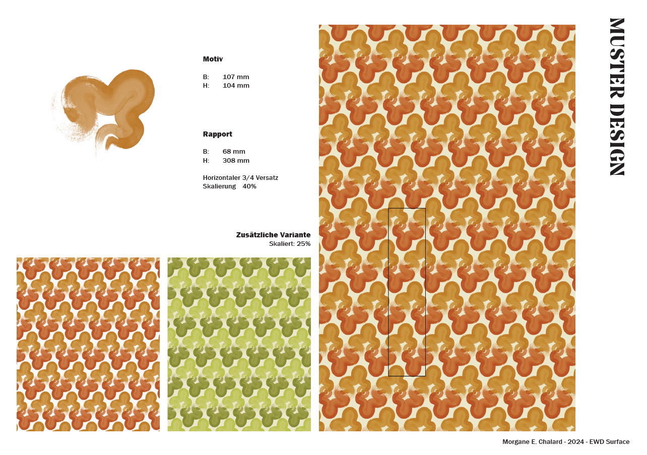 This is a pattern design for tea packaging. To create the design, I used three different methods: stamps, materials, and painting. I made several sketches using these techniques, then scanned and edited them in Photoshop. Finally, I created a range of pattern designs in Illustrator, which I divided into two collections.