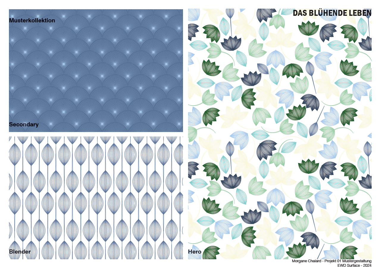This is a pattern design collection inspired by nature, specifically the graceful beauty of water lilies. To begin, I made several hand sketches, capturing the delicate yet powerful essence of the flowers, and then refined them in Illustrator to create unique patterns.